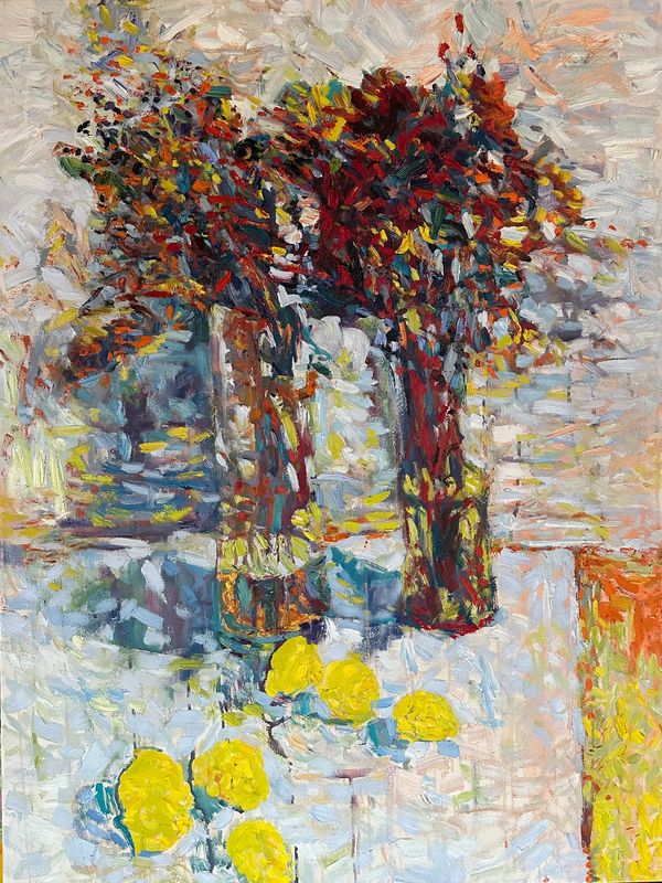 Still Life Waves with Lemons captures a table stirred by color and light, where bold blooms and bright lemons ripple like echoes of a fleeting summer afternoon.